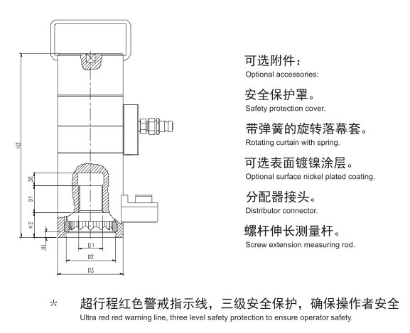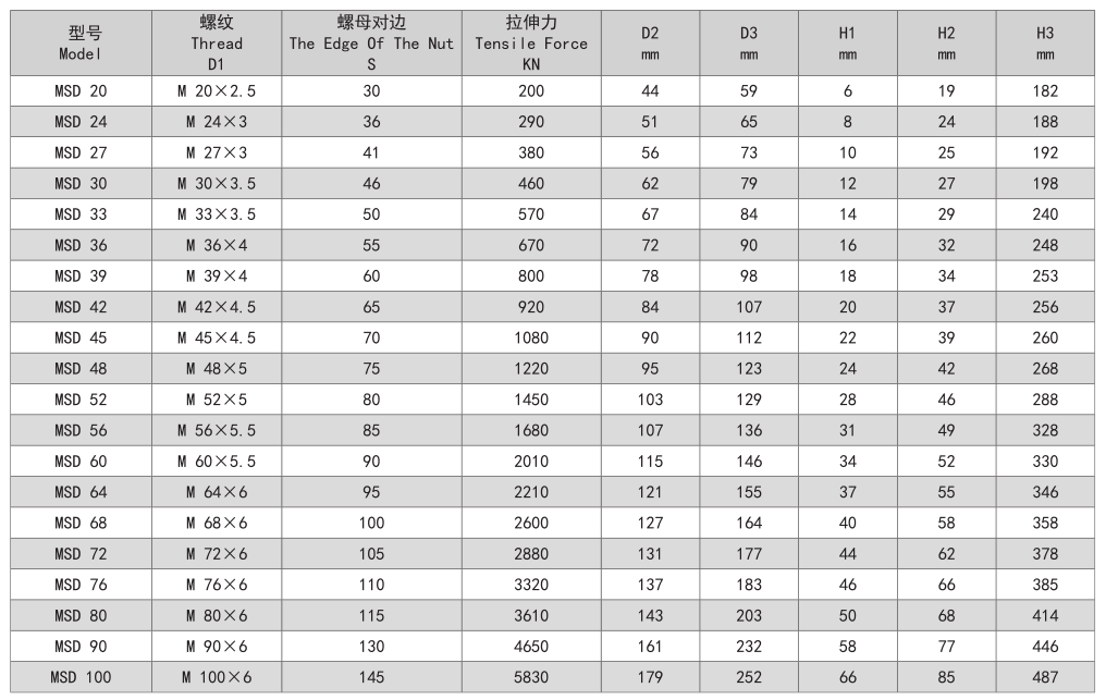 注:上表所示螺栓拉伸器是为拆装高强度 10.9 级螺栓,并根据伸长极限 0.2 的 90% 设计的;若需要更高的拉伸力,则使用表中螺栓拉伸头同样螺纹尺寸邻近的下一个较大的油缸(例如对 M42 来说,用 MSD45 来代替 MSD42) , 或进行特殊设计。以上单级拉伸器是本公司产品中很少一部分 ,90% 以上的拉伸器根据工况都需要专门特殊设计,我们有多年成熟的设计和现场使用经验,为你定做适合工况的产品;详情请与本公司联系。